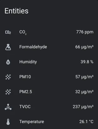 • formaldehyde (Required): The information for the formaldehyde sensor. Readings in µg/m³.
